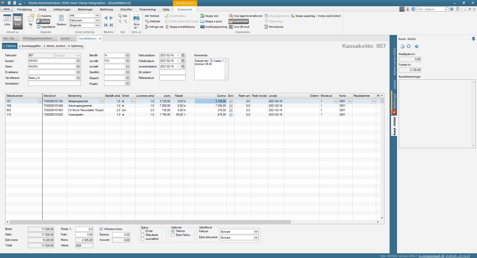 Kassan läser automatiskt in artiklar, priser, lager och kunder från Visma Administration så att du alltid har ett uppdaterat register.